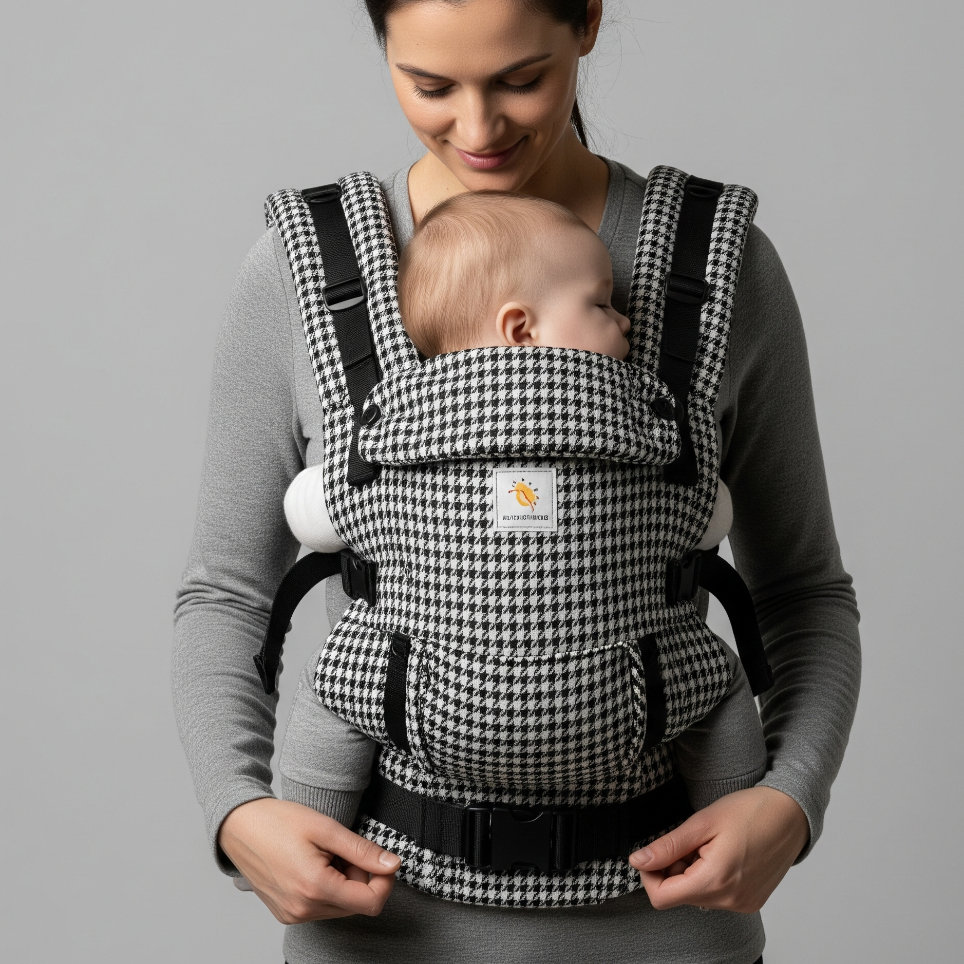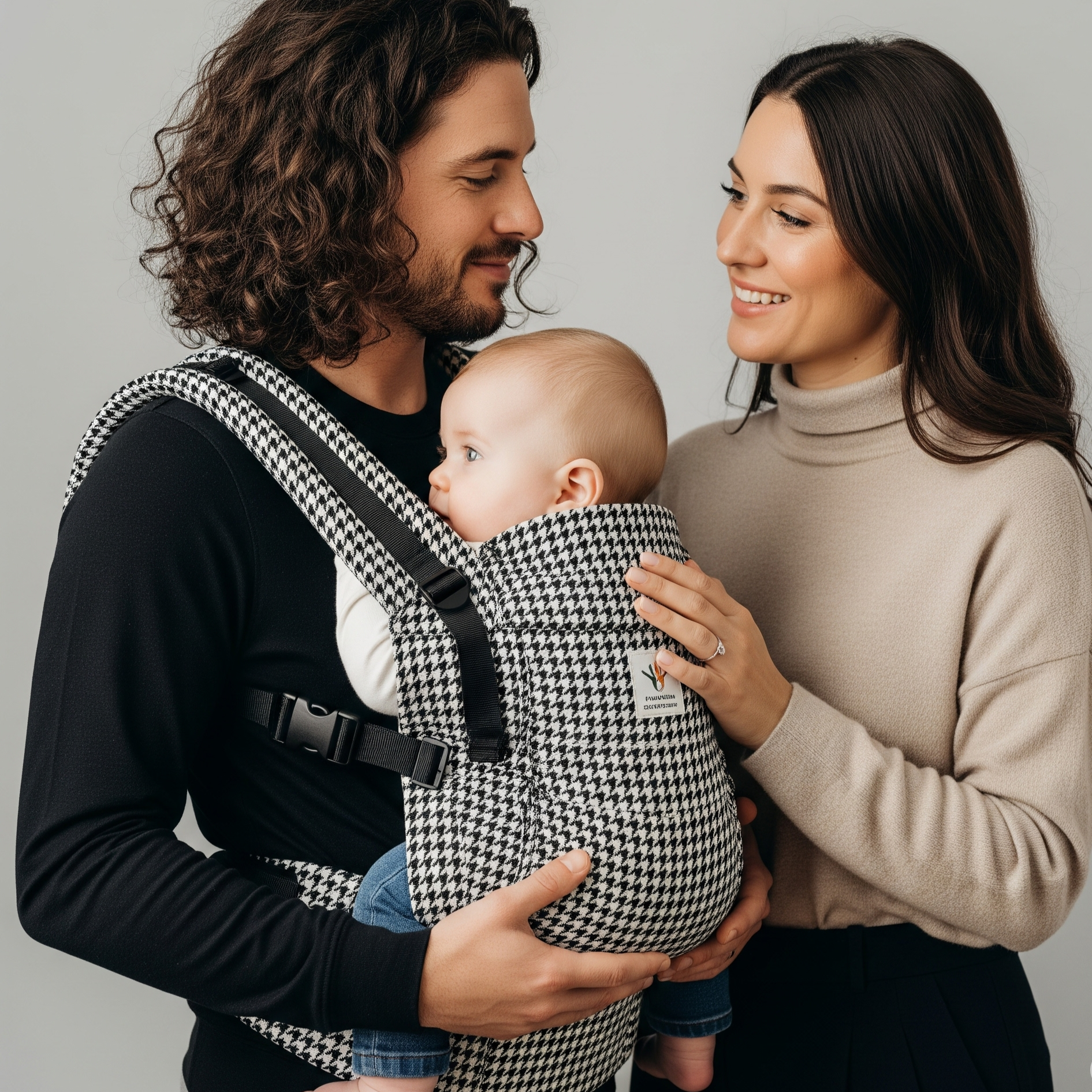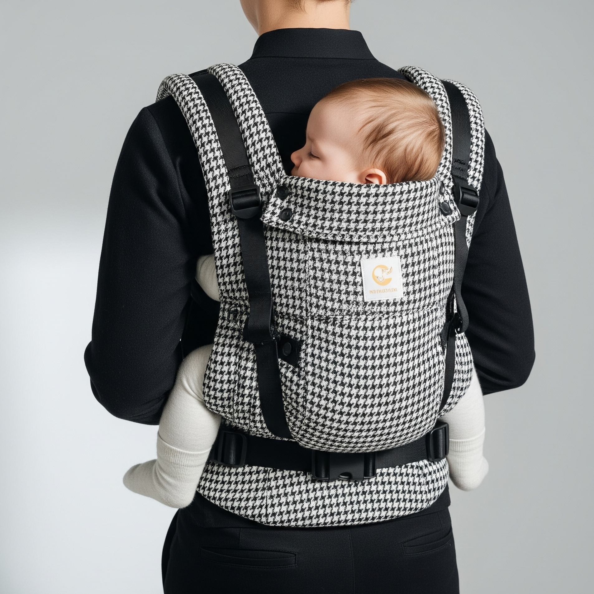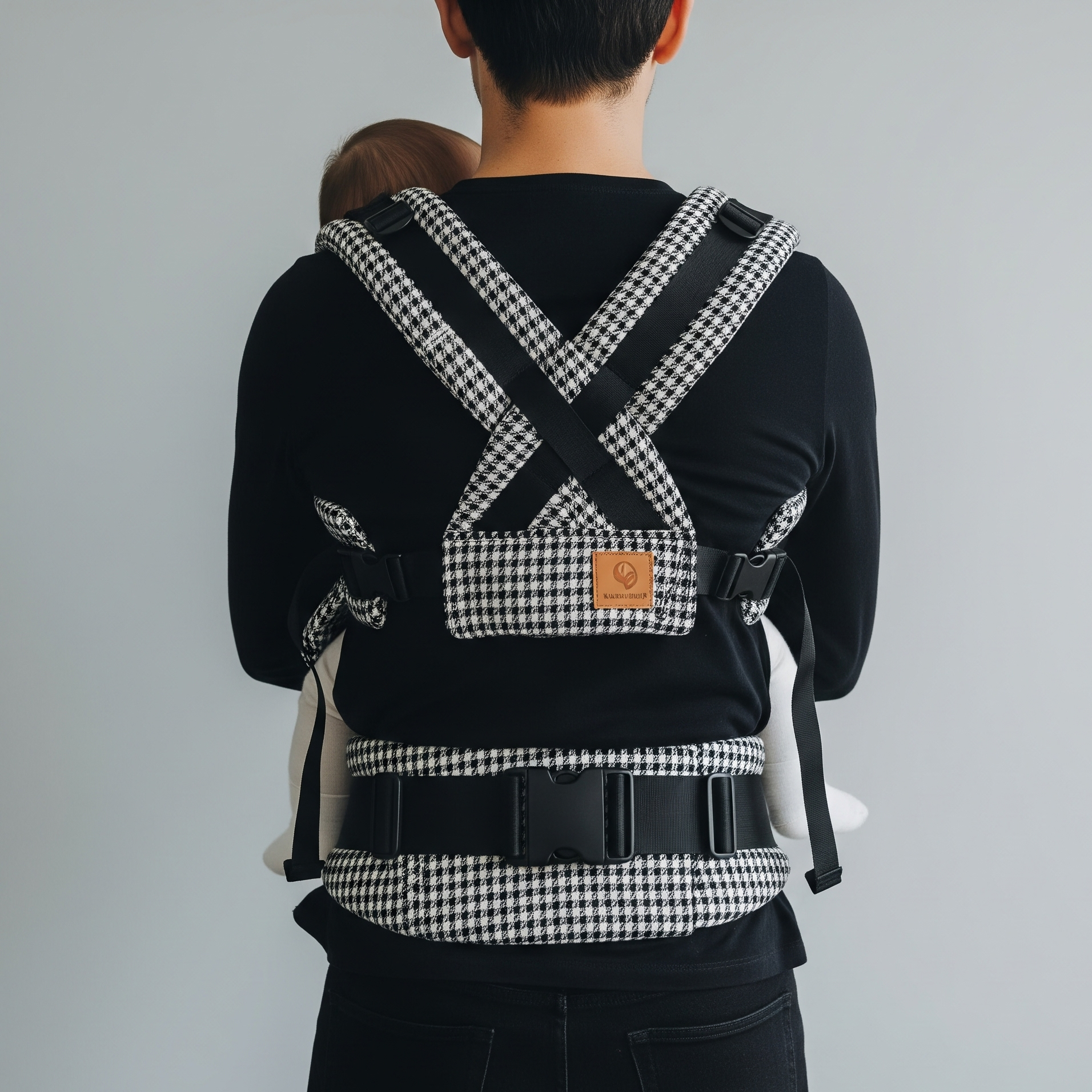 Denne bæreselen er et statement-plagg som kombinerer elegant design med funksjonell komfort. Med sitt tidløse houndstooth-mønster i svart og hvitt, passer den perfekt for den motebevisste forelderen. Den er laget av 100 % myk og pustende bomull, som sikrer at den er behagelig og skånsom mot babyens hud. Den ergonomiske utformingen gir optimal støtte, mens de justerbare skulder- og midjestroppene sikrer en perfekt passform for alle. Enkel å bruke med solide spenner for maksimal trygghet.